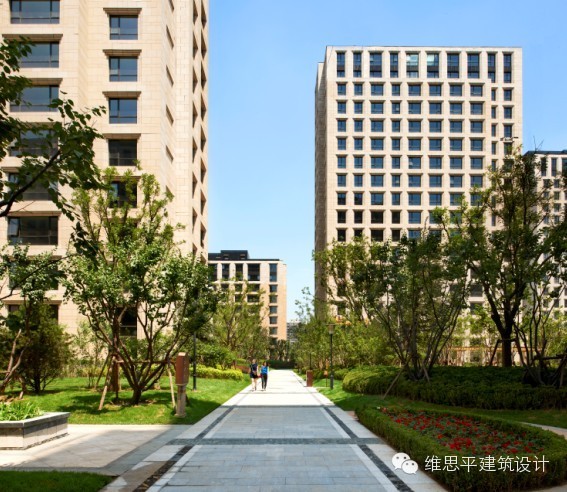 在建筑设计中,维思平同样采用了平直的设计手法,即使是同样大小室内空间的情况下,建筑体型凹凸多的就会有较多的散热面和受热面,相对平直的造型就可减少这方面的热损耗,同时也节省了立面材料。平直的体型,还减少了互相之间对阳光的遮挡。平直的布局则有利于整体地下车库的高效排布,室外管线也可更靠近建筑,种树的空间因此也得以扩展。